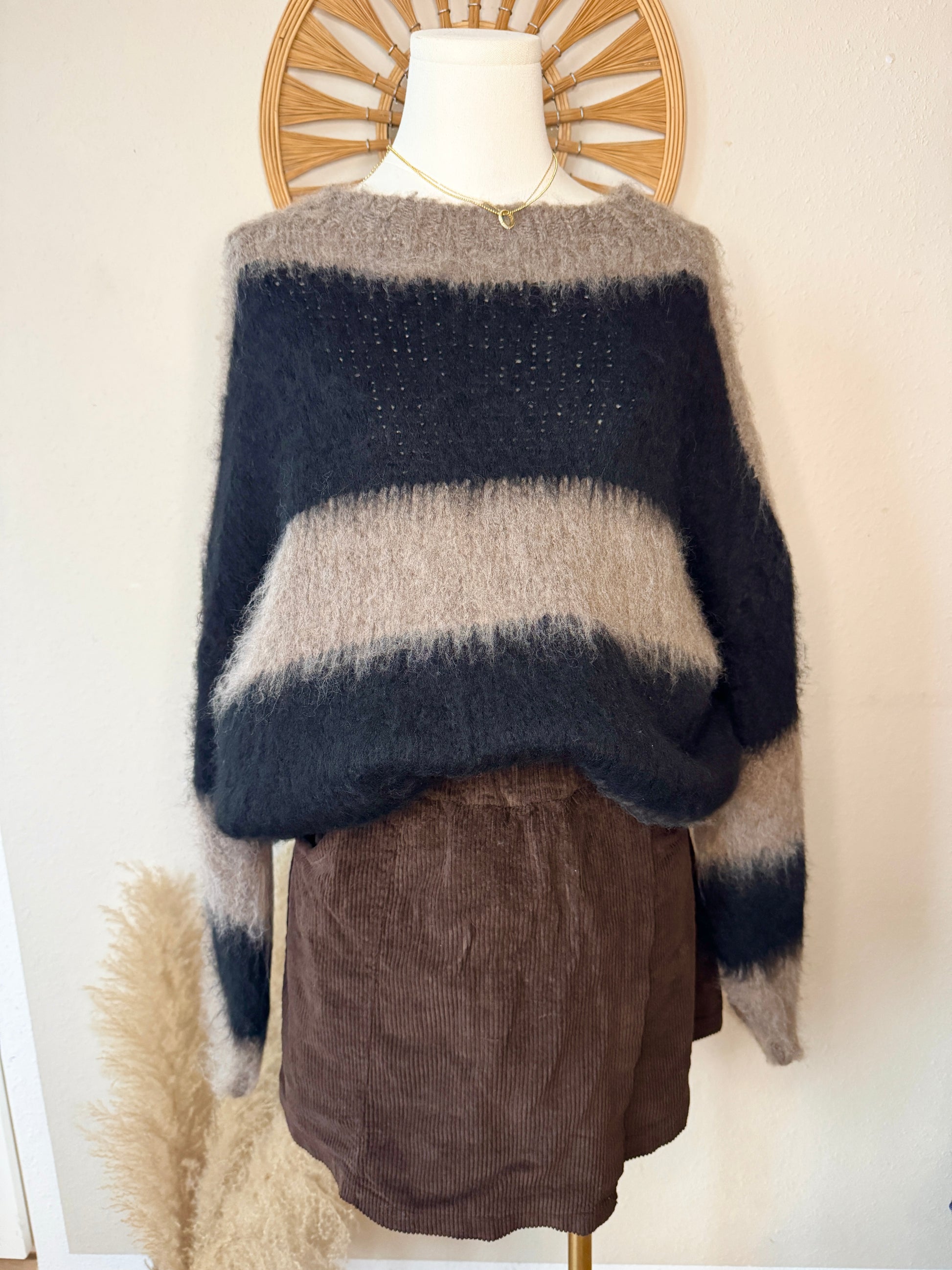 Der Pullover Nora bringt genau die Mischung aus cozy und chic, die du im Alltag liebst. Durch seinen weichen Wollanteil fühlt er sich warm, kuschelig und hochwertig an, während das klassische Streifenmuster ihm einen modernen, frischen Look verleiht.